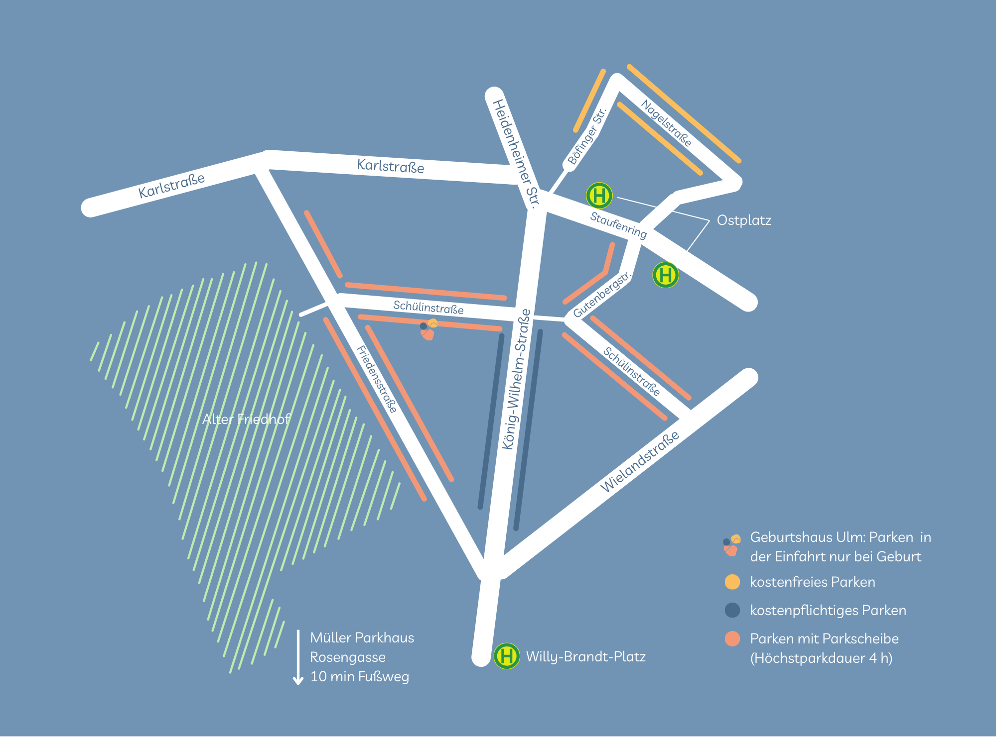 Das Geburtshaus Ulm liegt in der Parkzone G. In dieser Parkzone könnt ihr aktuell mit Parkscheibe bis zu vier Stunden kostenlos parken. Zukünftig soll die Parkzone mit Parkscheinautomaten ausgestattet werden, auch dann beträgt die Höchstparkdauer vier Stunden und es muss werktags (Montag bis Samstag) zwischen 9 und 20 Uhr ein Parkschein gezogen werden. Weitere Parkmöglichkeiten, die fußläufig erreichbar sind: